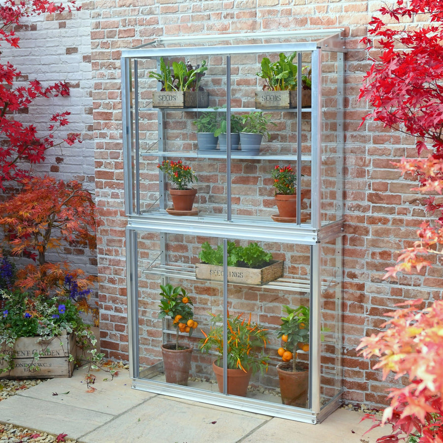 The Westminster 3' 4" small greenhouse, crafted with an aluminium frame and toughened glass. This compact greenhouse boasts adjustable seed tray shelves for your gardening needs.