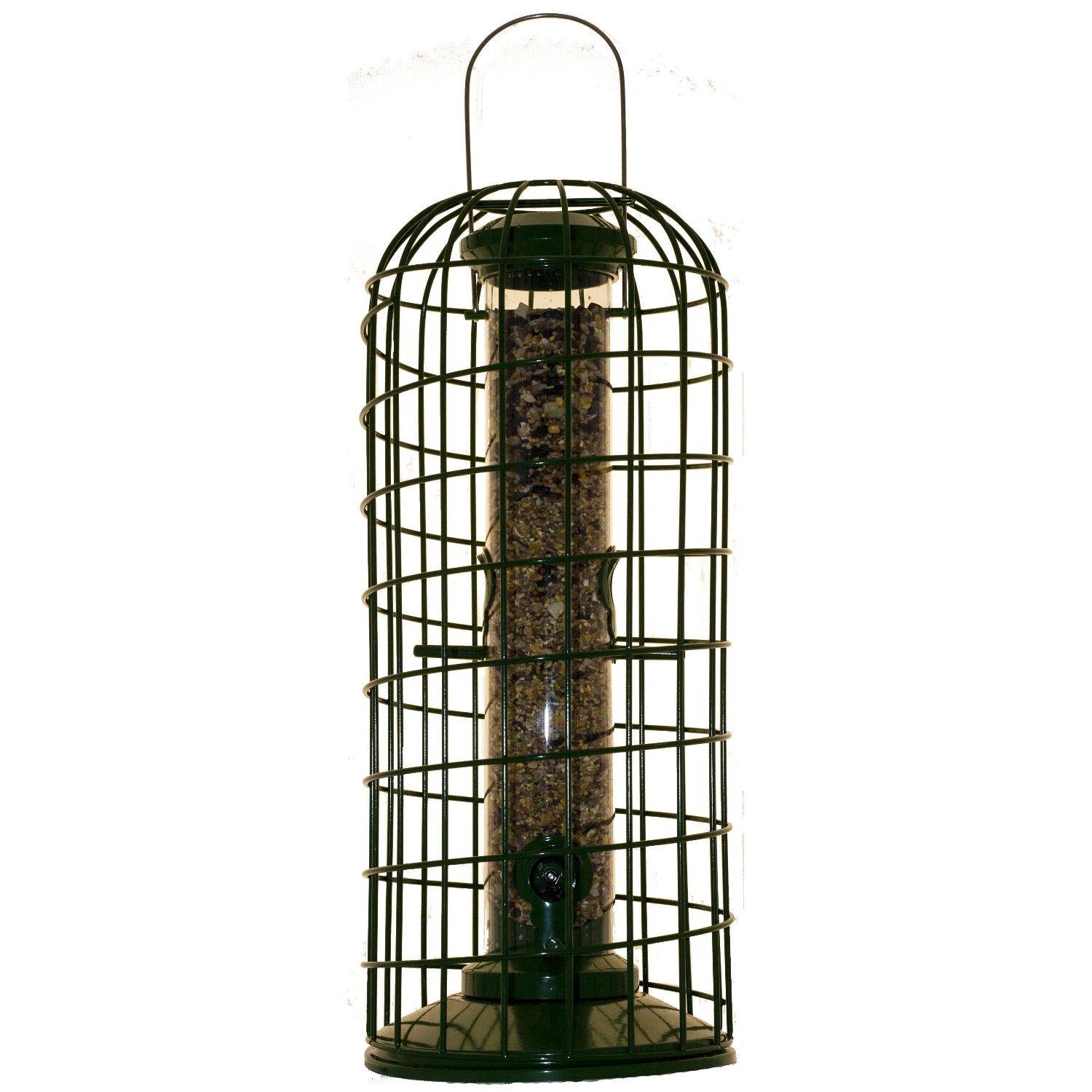 These squirrel-proof (and large bird-proof) bird feeders work by the holes in the surrounding protective cage only being large enough to let in the smaller species of garden bird. Squirrels and larger birds cannot fit through the cage mesh and soon lose interest in the bird feeder. The bird feeder inside is the same quality bird feeder you can buy individually. The bird feeder is mounted on the metal seed catcher tray, which forms the base of the guardian cage. If you want any spilled food to be deflected onto the floor so that the excluded animals can still feed, then the catcher tray can be turned upside down to the desired position (either the seed deflector or the catcher).